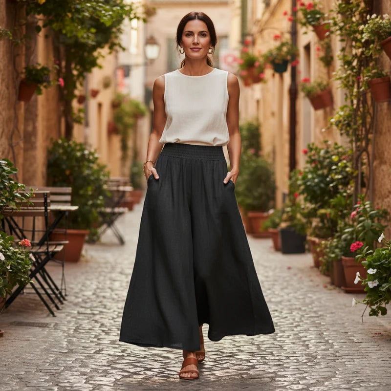 Ihr weiter Schnitt und der leichte Stoff erzeugen eine fließende Bewegung bei jedem Schritt, die sanft den Körper umspielt.